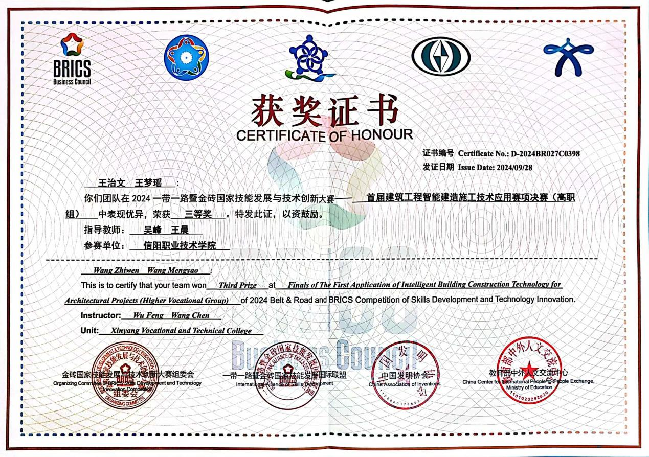 9月26日至28日,在2024年度“一带一路”暨金砖国家技能发展与技术创新大赛首届建筑工程智能建造施工技术应用赛项决赛中,我校欧美色视频综合在线观看23级智能建造技术专业学生王治文,王梦瑶经过激烈竞争,凭借扎实的专业技能和出色的表现,成功取得了全国三等奖的优异成绩