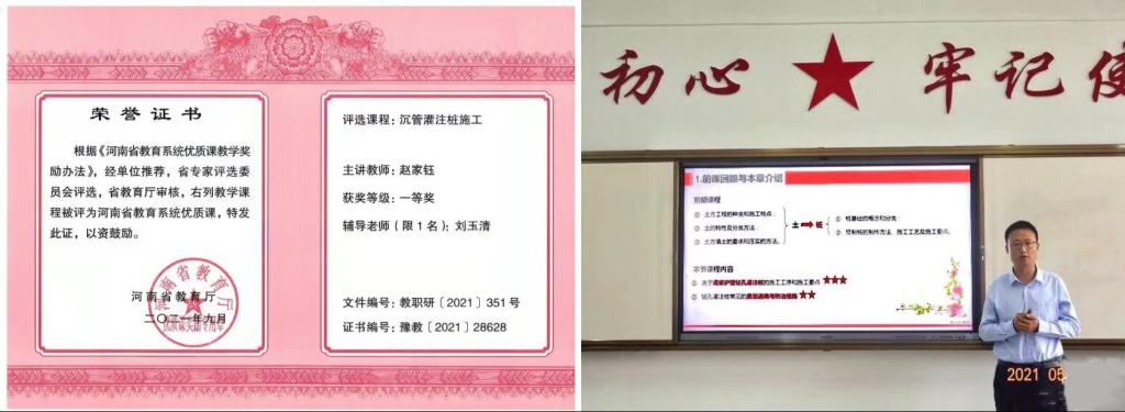 2021年5月28日,欧美色视频综合在线观看教师赵家钰参加2021年河南省中等职业学校优质课教学评选,参选课程《沉管灌注桩施工》荣获河南省教育系统优质课一等奖。