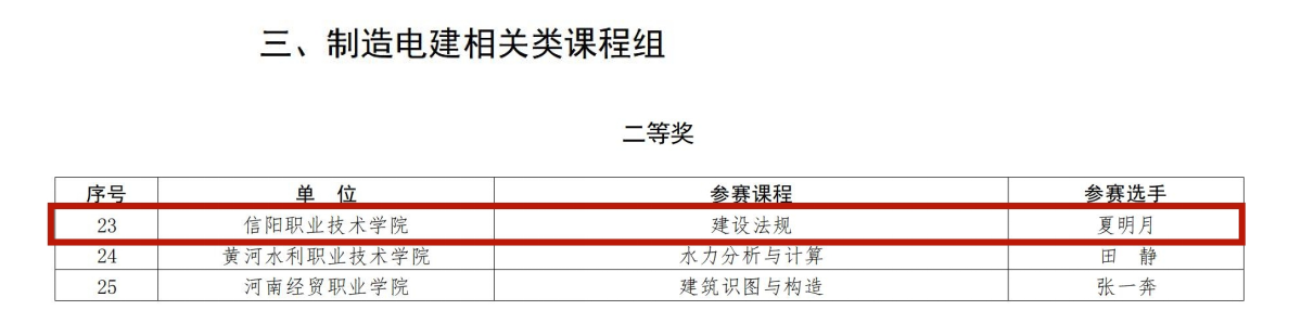5月15日,2022年河南省高等职业教育课程思政教学创新大赛拟获奖名单公示,我院教师夏明月荣获制造电建相关类课程组二等奖。