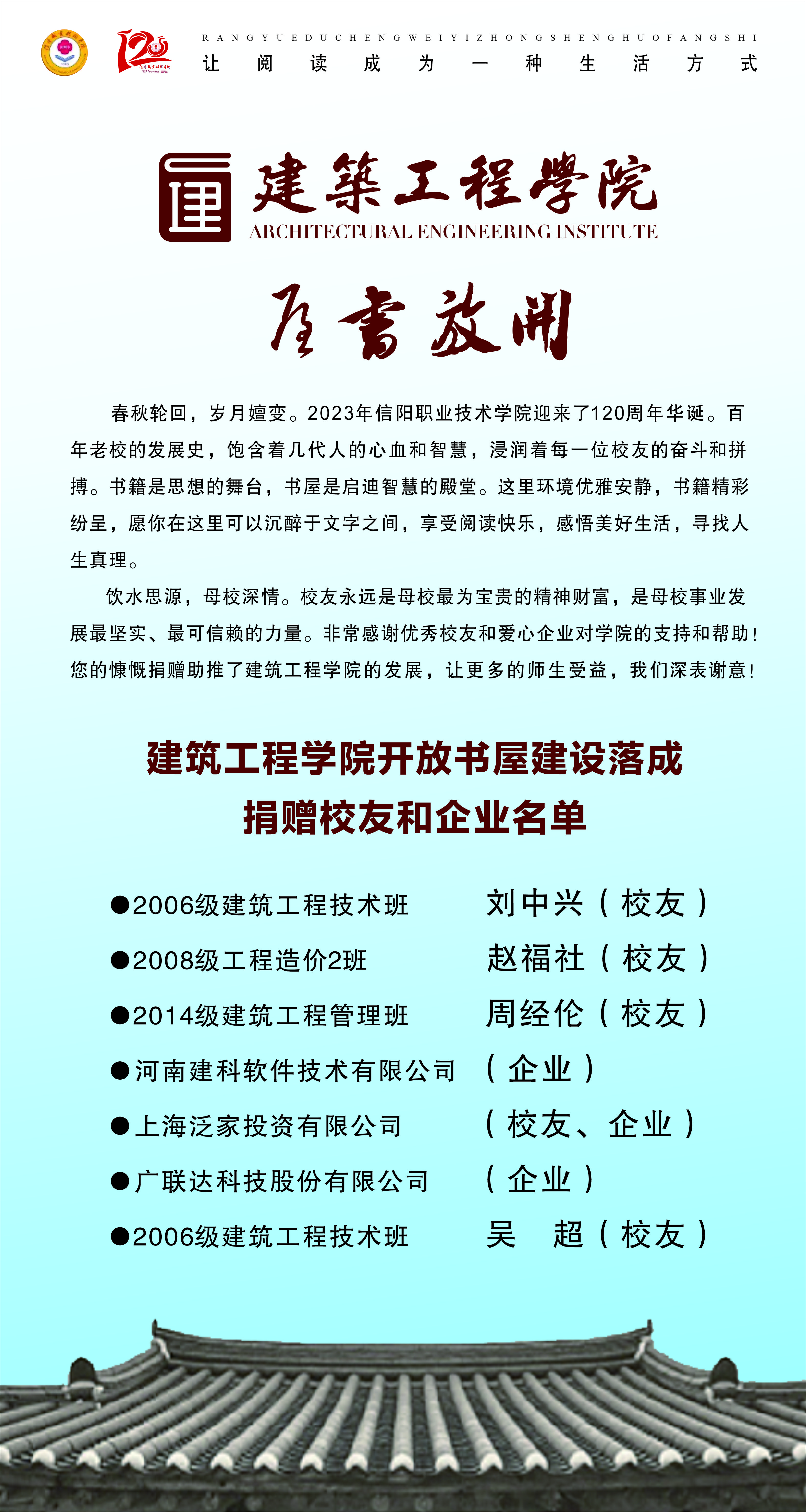一百二十载砥砺前行,一百二十载风雨同舟。信阳职业技术学院的发展凝聚了无数师生的心血和真情,承载了社会各界朋友的祝福和关心,未来的信职更需要海内外校友和社会各界朋友的鼎力支持。在120周年校庆期间,校友、企业捐建的开放书屋将正式对外开放,我们非常欢迎各学院师生的到来,期待与您一起在这个特别的地方留下美好的回忆。