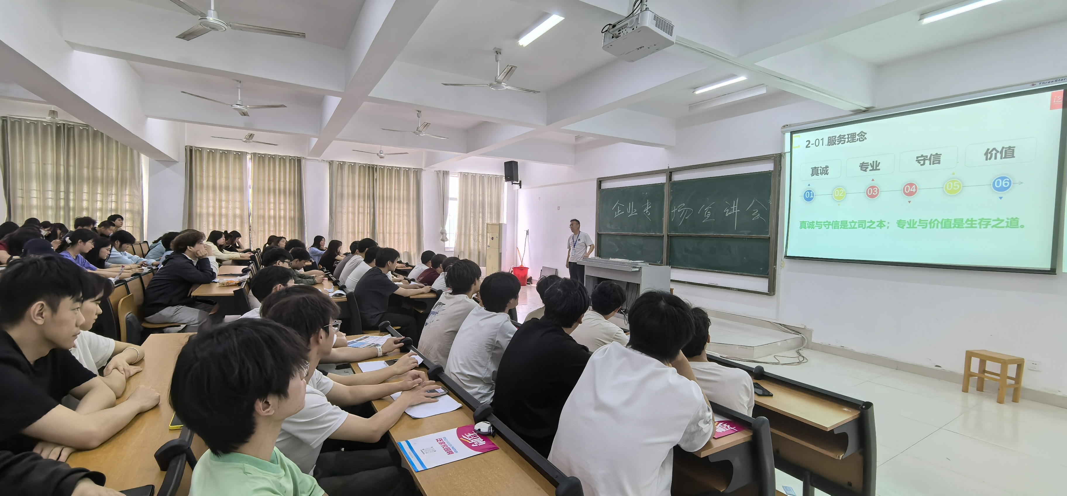 当天下午,学院在教学楼组织开展了专场招聘会。华高科技(苏州)有限公司、上海泛家装饰有限公司、太平洋房地产经纪有限公司和浙江舜宇集团有限公司4家企业,依次通过 PPT 展示、视频播放等形式,向学生介绍企业的整体情况、薪资待遇、工作环境等内容,并现场解答同学们的疑问。招聘会后,到场学生和企业代表通过QQ群、微信群互留联系方式,并确定后续的网络面试流程。